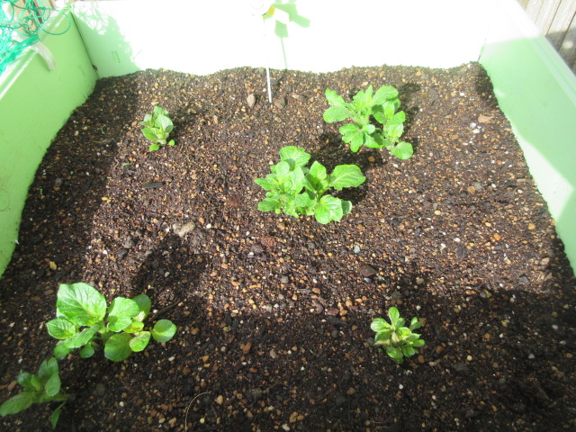 土を25センチほど入れたこのプランターに5つ種いもを植えてます